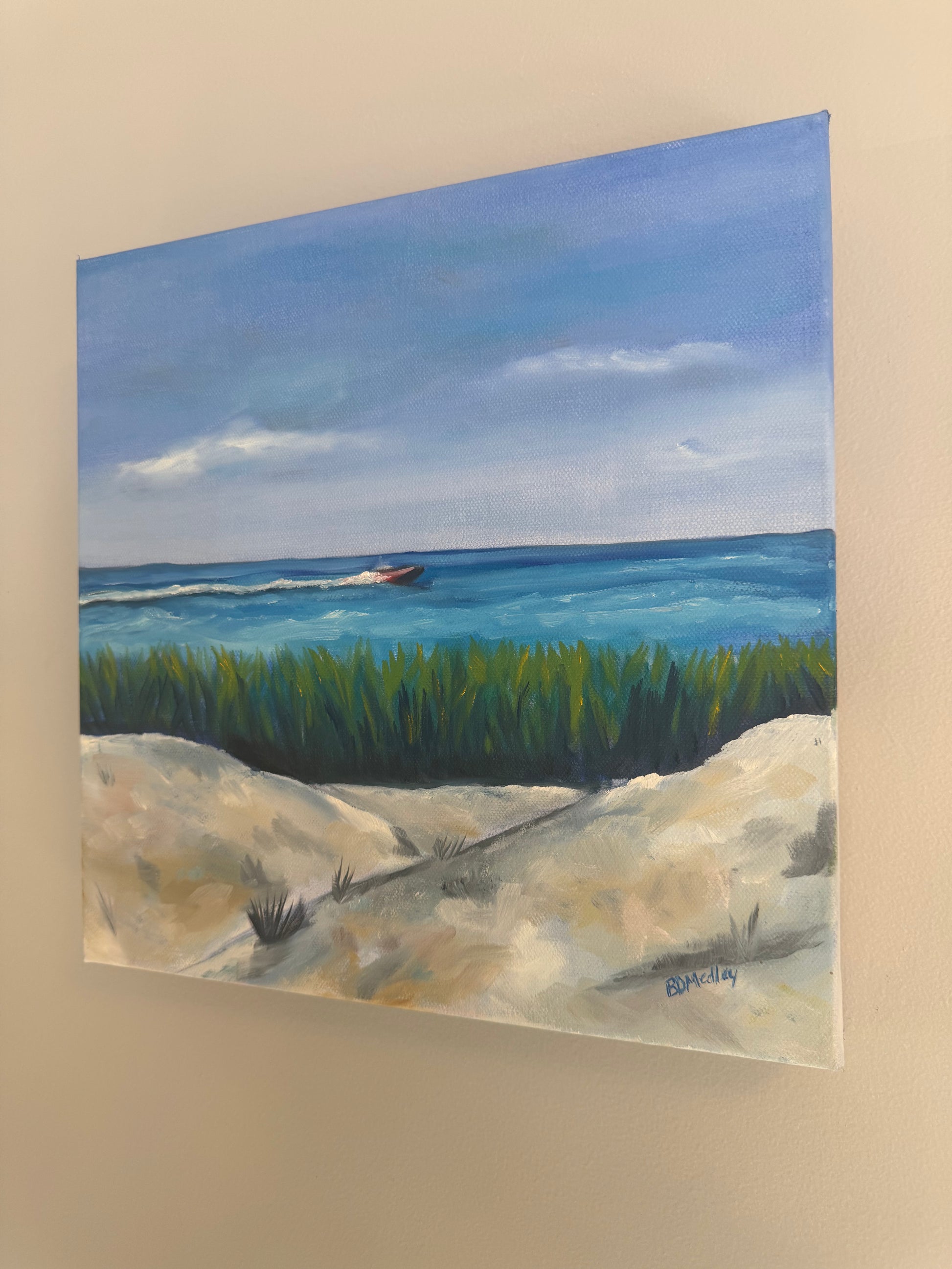 10x10 unframed oil painting of speedboat at Cape Cod; 2024